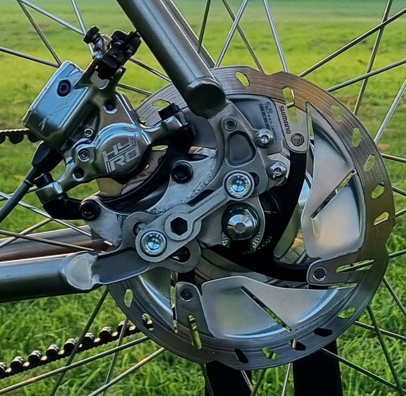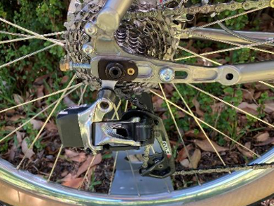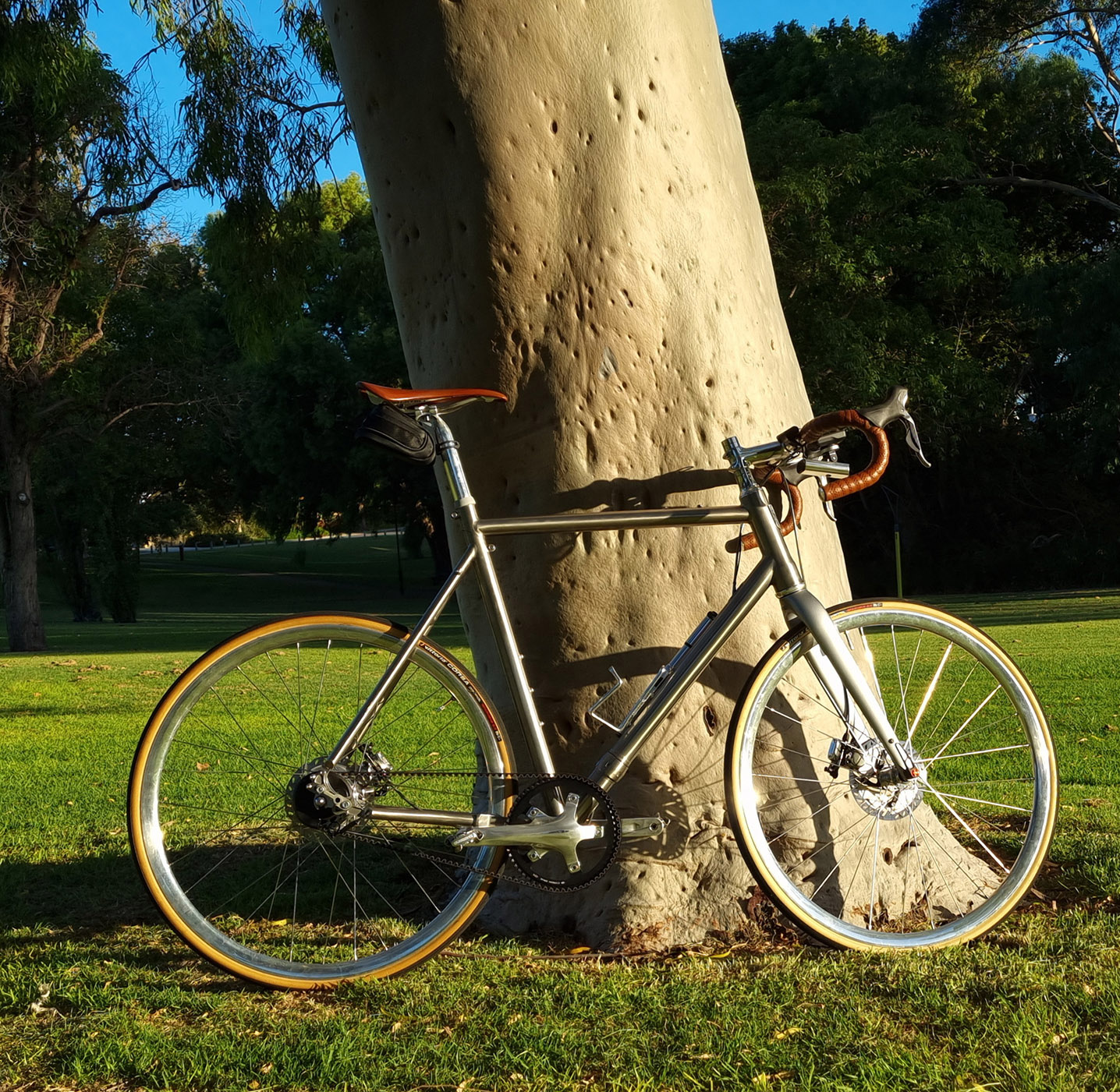 Gates Carbon Belt Drive. Shimano Alfine 11 Speed Internal Gear Hub. Di2 Electronic Shifting. Cable actuated Hydraulic Disc Brakes. Rocker Drop out with different insert options so can change to thru axel and cassette set up. Belt Drive frame split. External downtube coupler. Custom saddle. Custom wheel build. 38mm tyre clearance. Good for road and gravel.