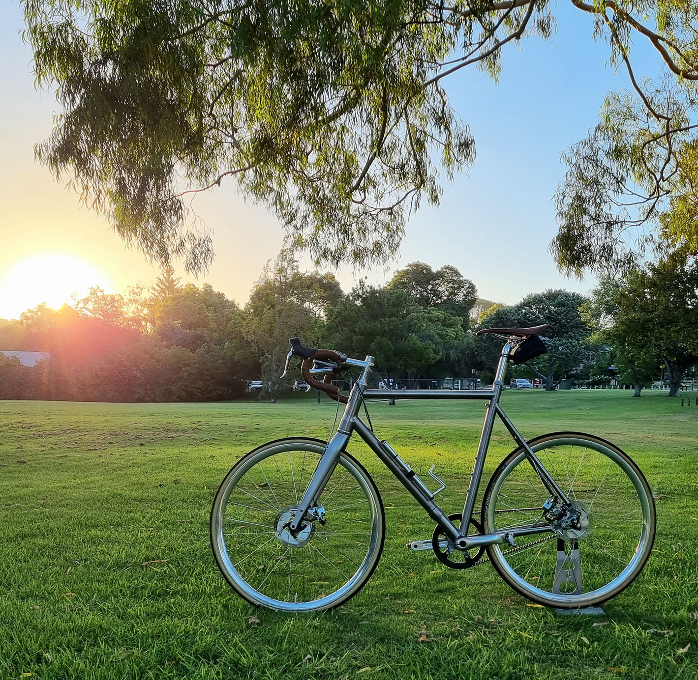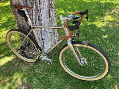 Conventional Chain Drive. SRAM eTap (wireless makes for easy packing & assembly during travel). Cable Disc Brakes. Sliding Drop out and Fork chip to adjust wheel base and fork trail depending on riding style and tyre size. Viscoset damper for gravel. Belt Drive frame split for optionality. Internal downtube coupler. Custom saddle. Custom wheel build with Dynamo hub to power the lights (and GPS). 60mm tyre clearance on 700/ 29”wheel rim and 65mm on 650/ 27.5”wheel rim. Good for road and excellent for Gravel.